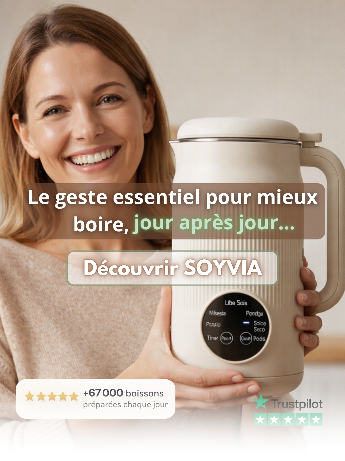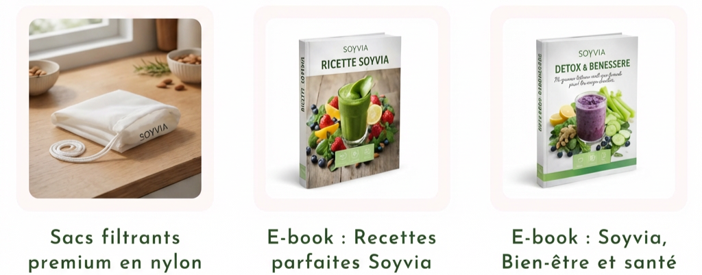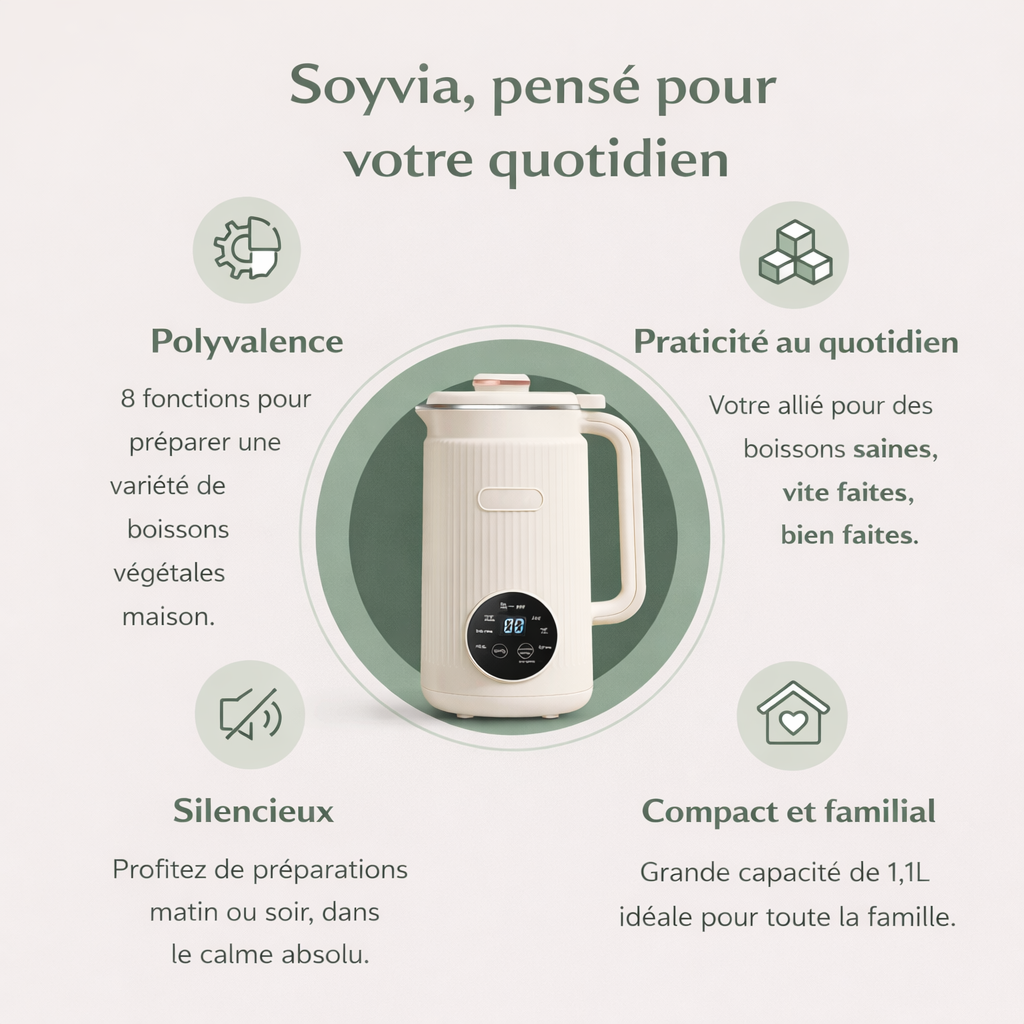 Soyvia transforme vos routines : laits végétaux maison, jus frais, soupes & smoothies — en un seul geste, avec nettoyage automatique.